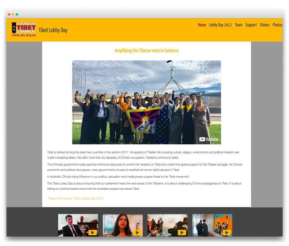 We’ve made 2 micro sites for the Australian Tibet Council. The first was Our Tibet Story, which we designed around the parent site colours. The second site for Tibet Lobby day was created using the same WordPress theme to keep things simple for the team when it came to in-house content management.