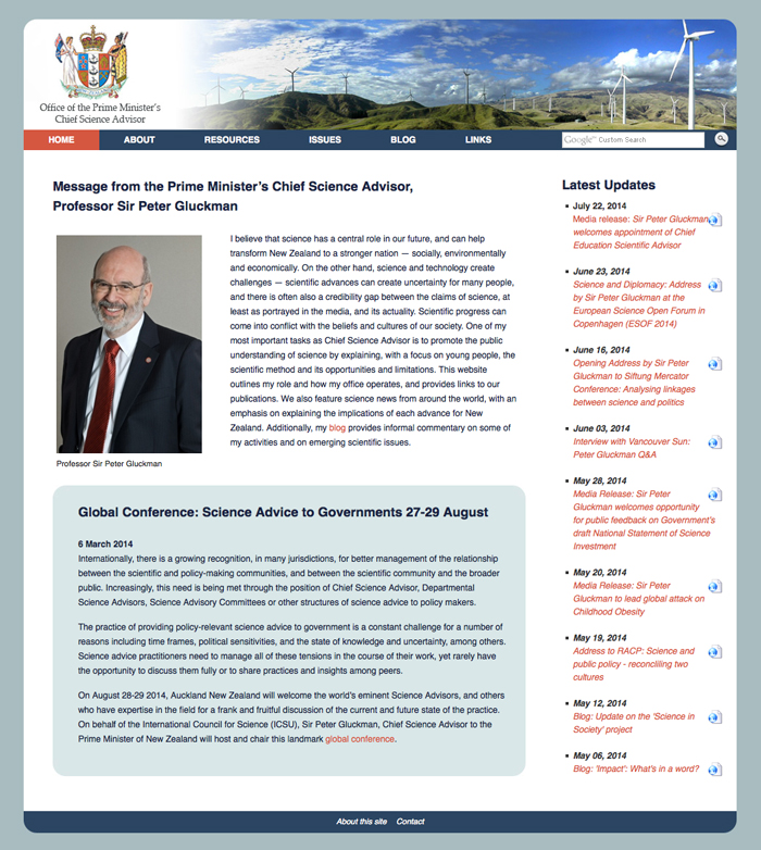 BRIEF: To create a standards-compliant website for the New Zealand Prime Minister’s Chief Science Advisor under tight deadlines. Several special features were requested including a J-Query slideshow, navigation that would function without javascript enabled and a Google Custom Search function.